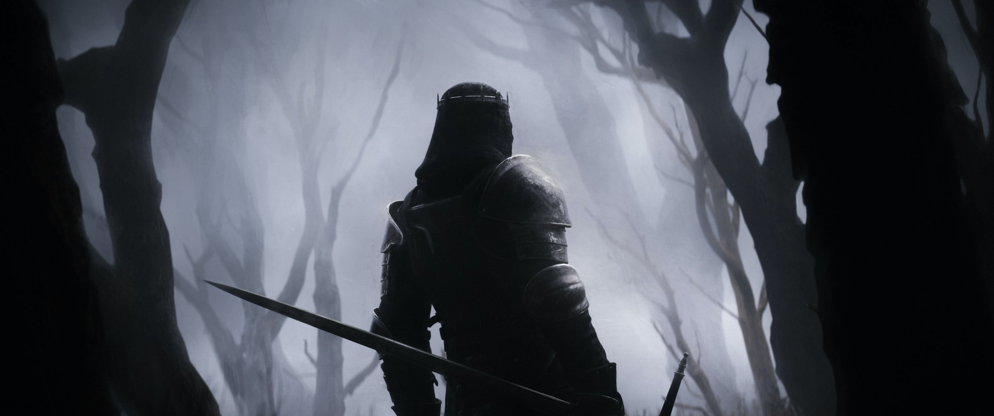 Обои: воин, лес, меч - 3440x1440