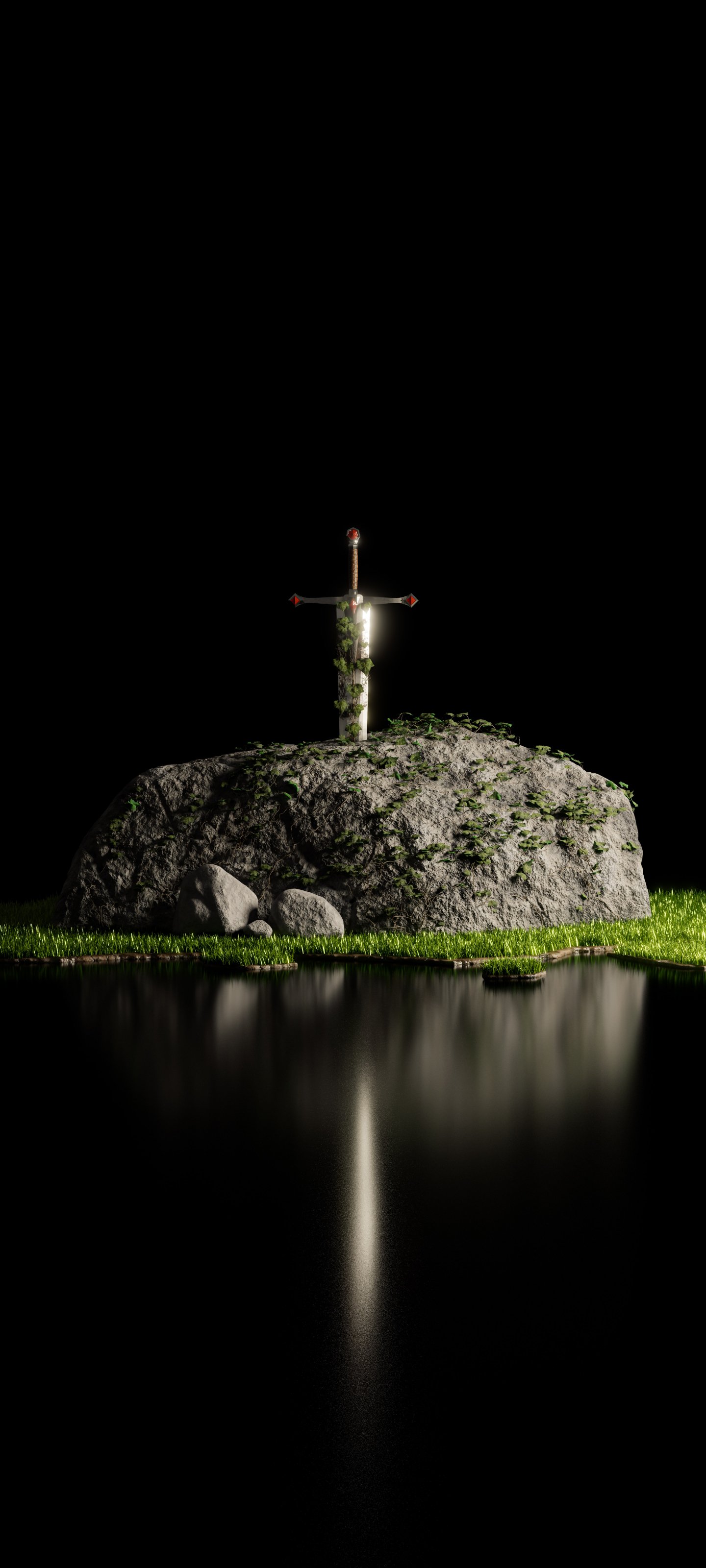 Обои: меч, камень, озеро - 1440x3200