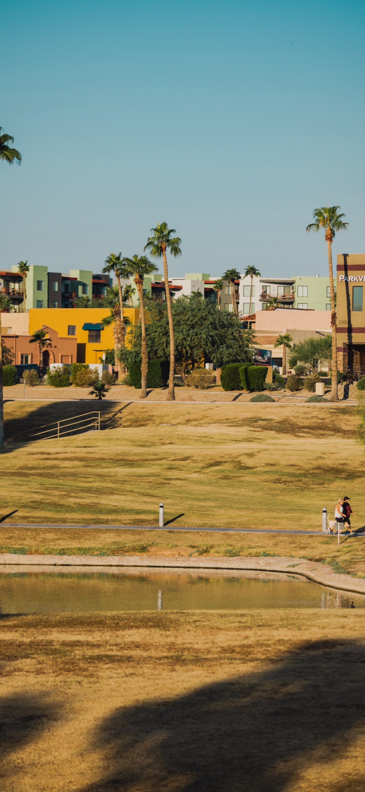 Обои: пальмы, озеро, город - 1170x2532