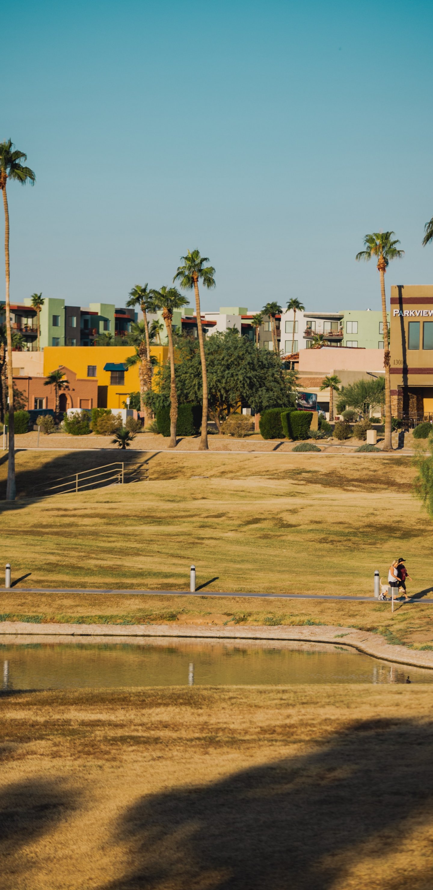 Обои: пальмы, озеро, город - 1440x2960