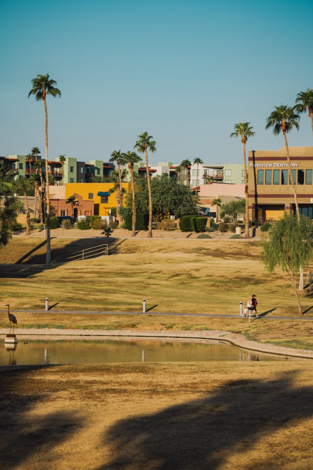 Обои: пальмы, озеро, город - 640x960