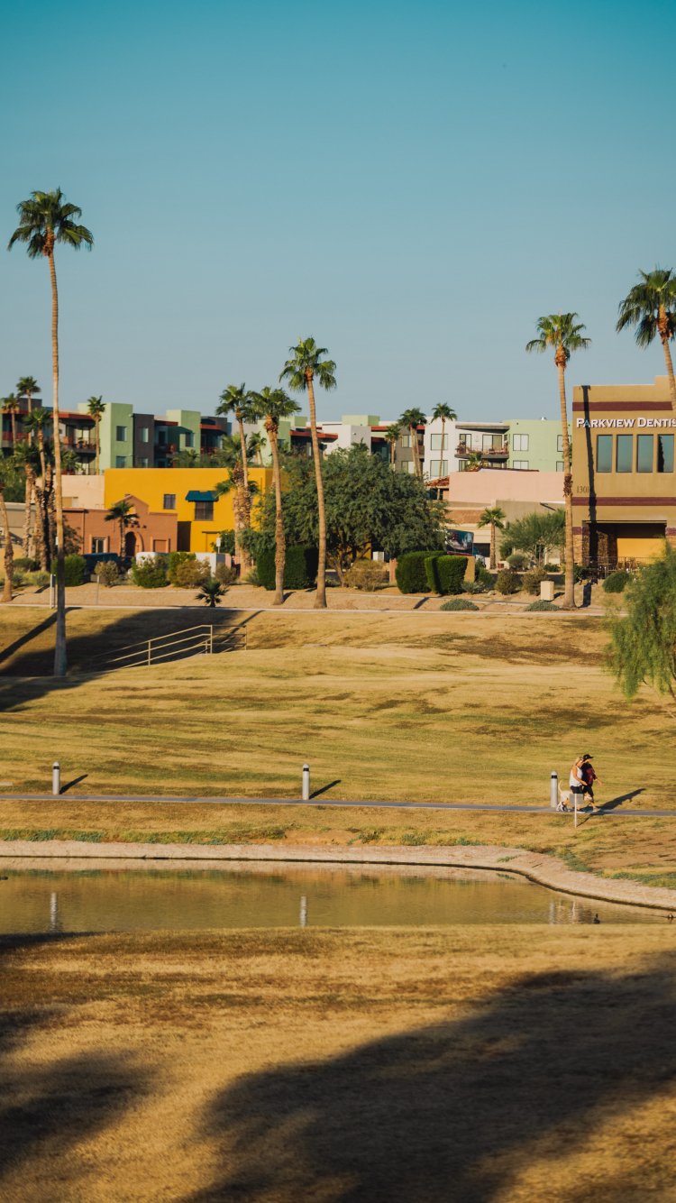 Обои: пальмы, озеро, город - 750x1334