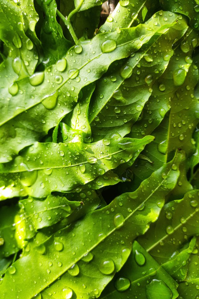 Обои: листья чая, капельки росы - 640x960