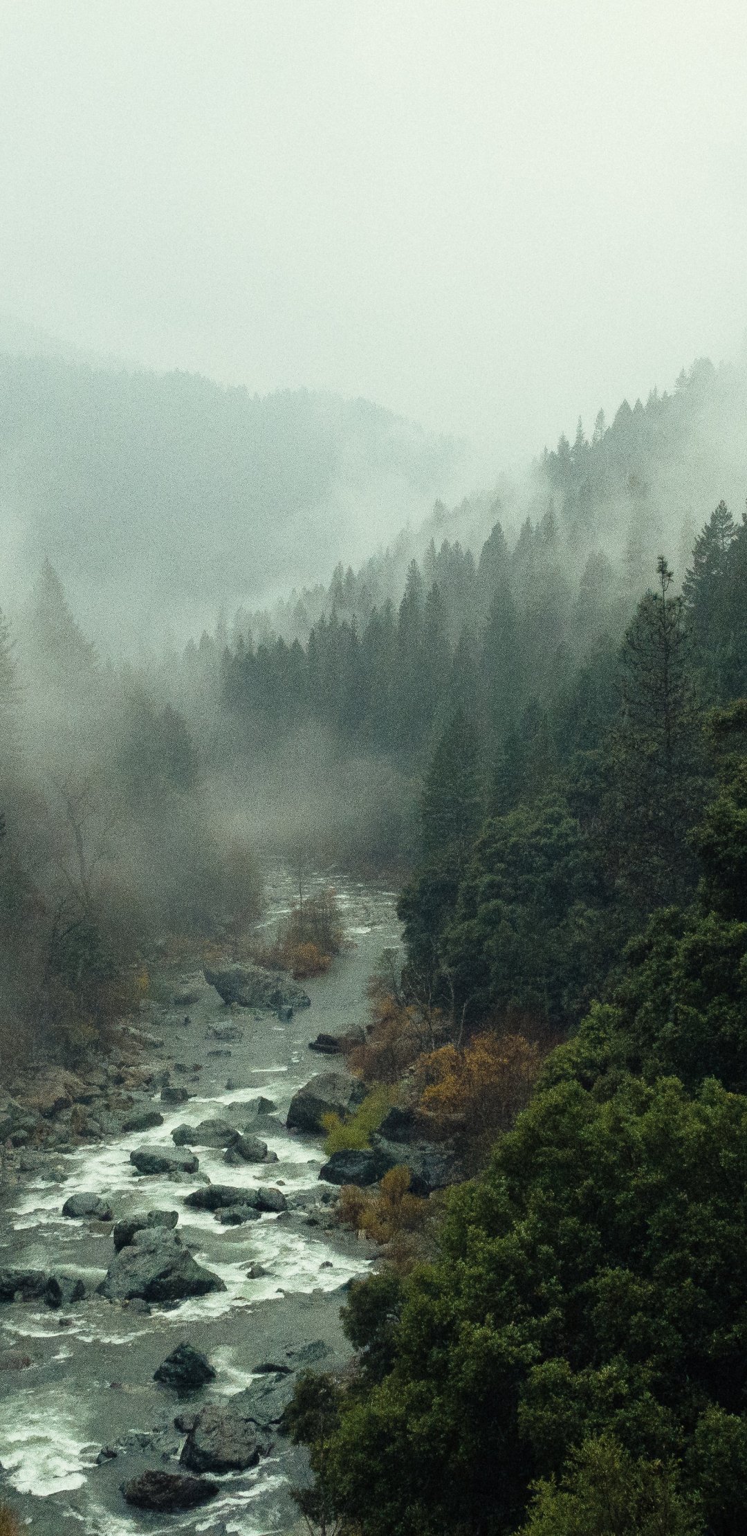 Обои: река, лес, туман - 1080x2220