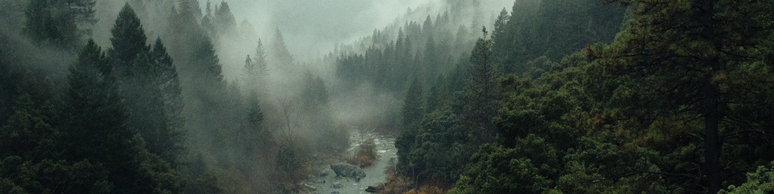 Обои: река, лес, туман - 1590x400