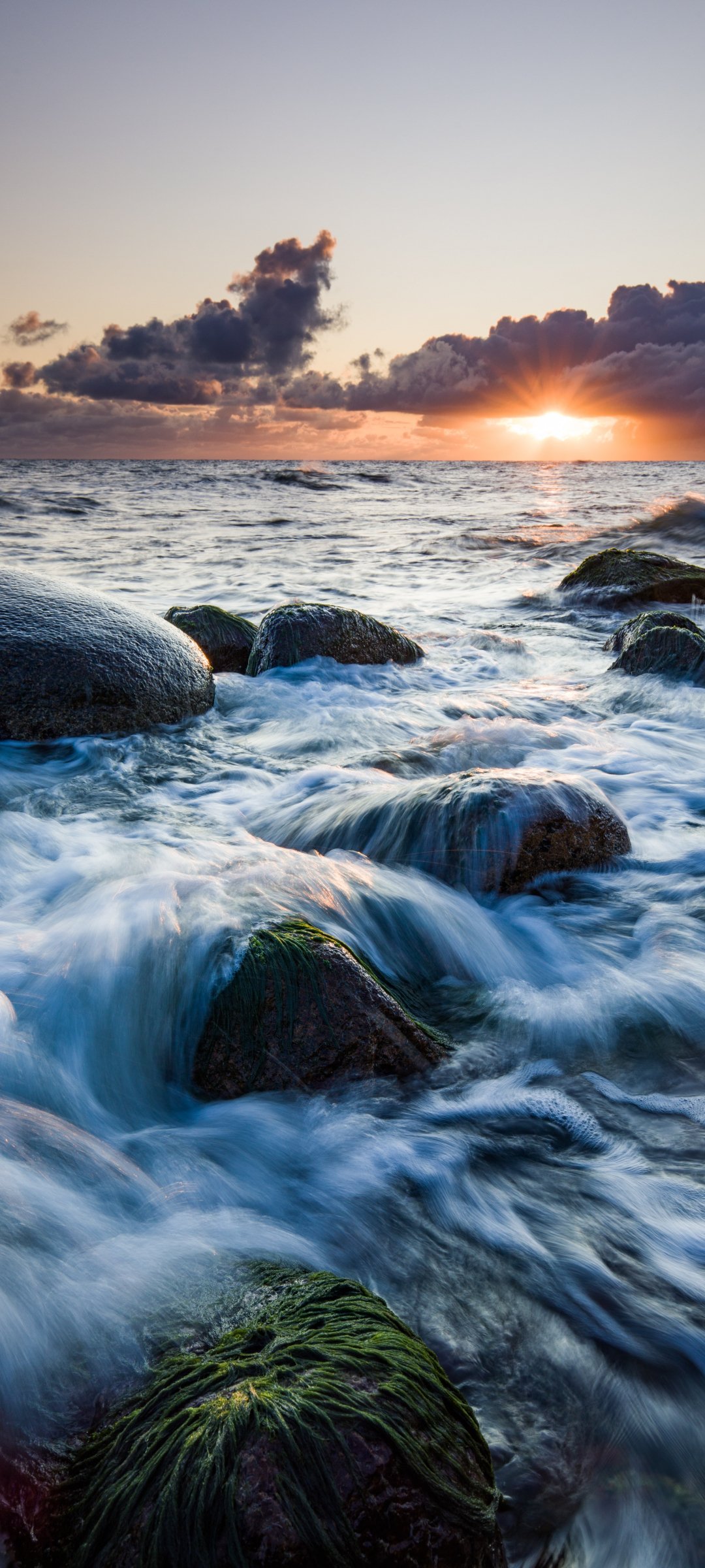 Обои: морские волны, восход солнца - 1080x2400