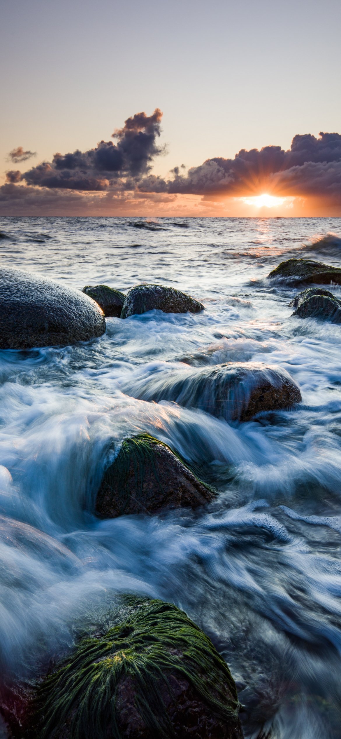 Обои: морские волны, восход солнца - 1170x2532