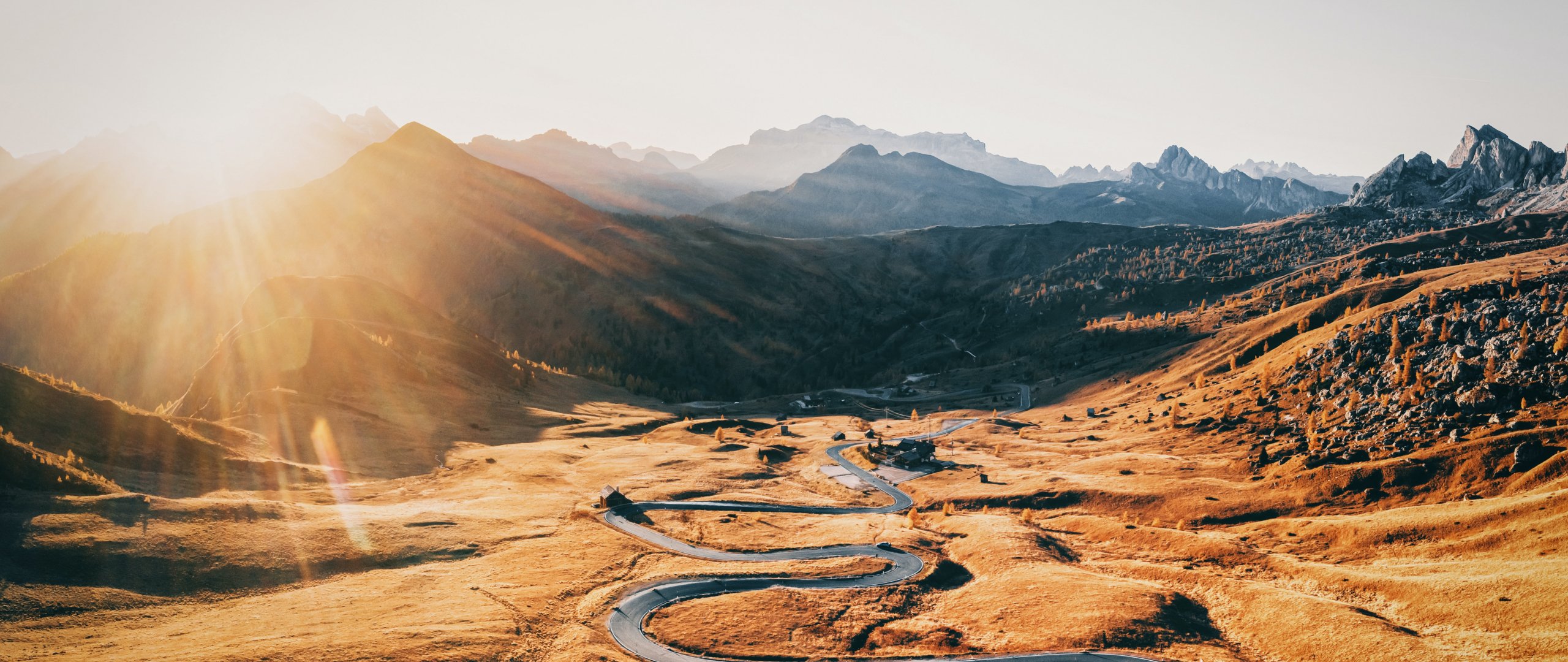 Обои: дорога между гор, горные вершины - 2560x1080