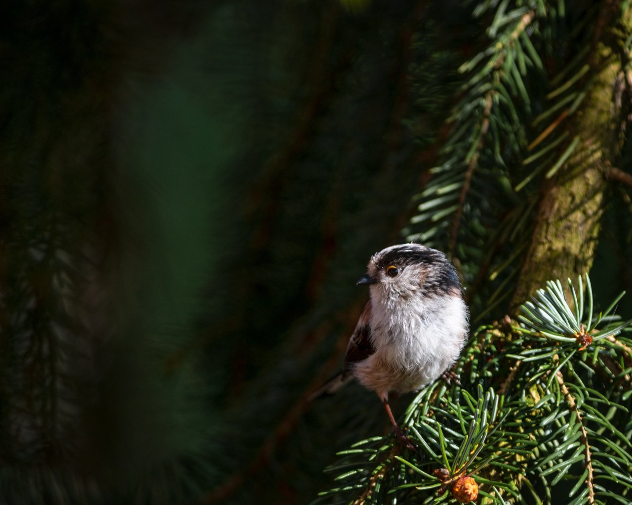 Обои: маленькая птичка, в еловых ветках - 1280x1024