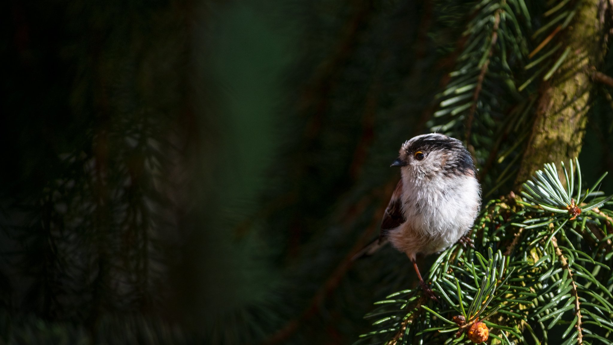 Обои: маленькая птичка, в еловых ветках - 2048x1152