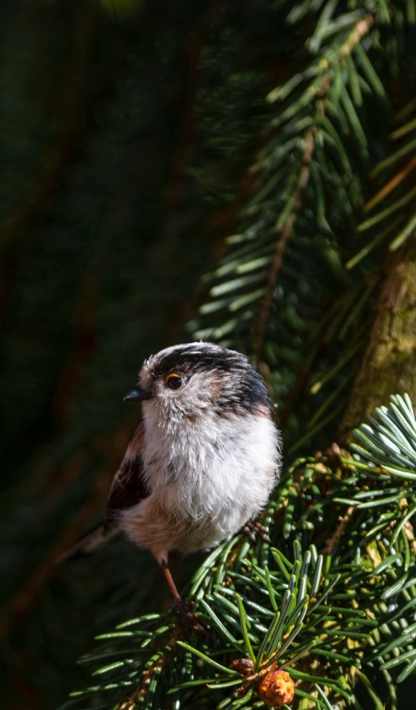 Обои: маленькая птичка, в еловых ветках - 600x1024