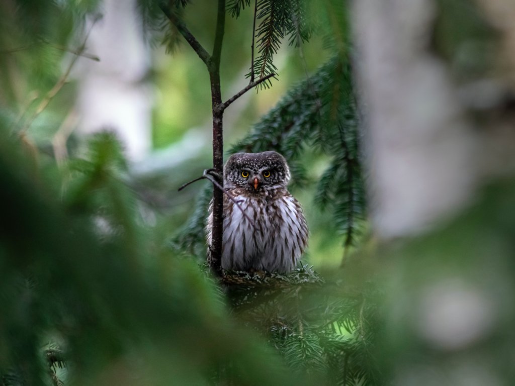 Обои: сова, в еловых ветках - 1024x768