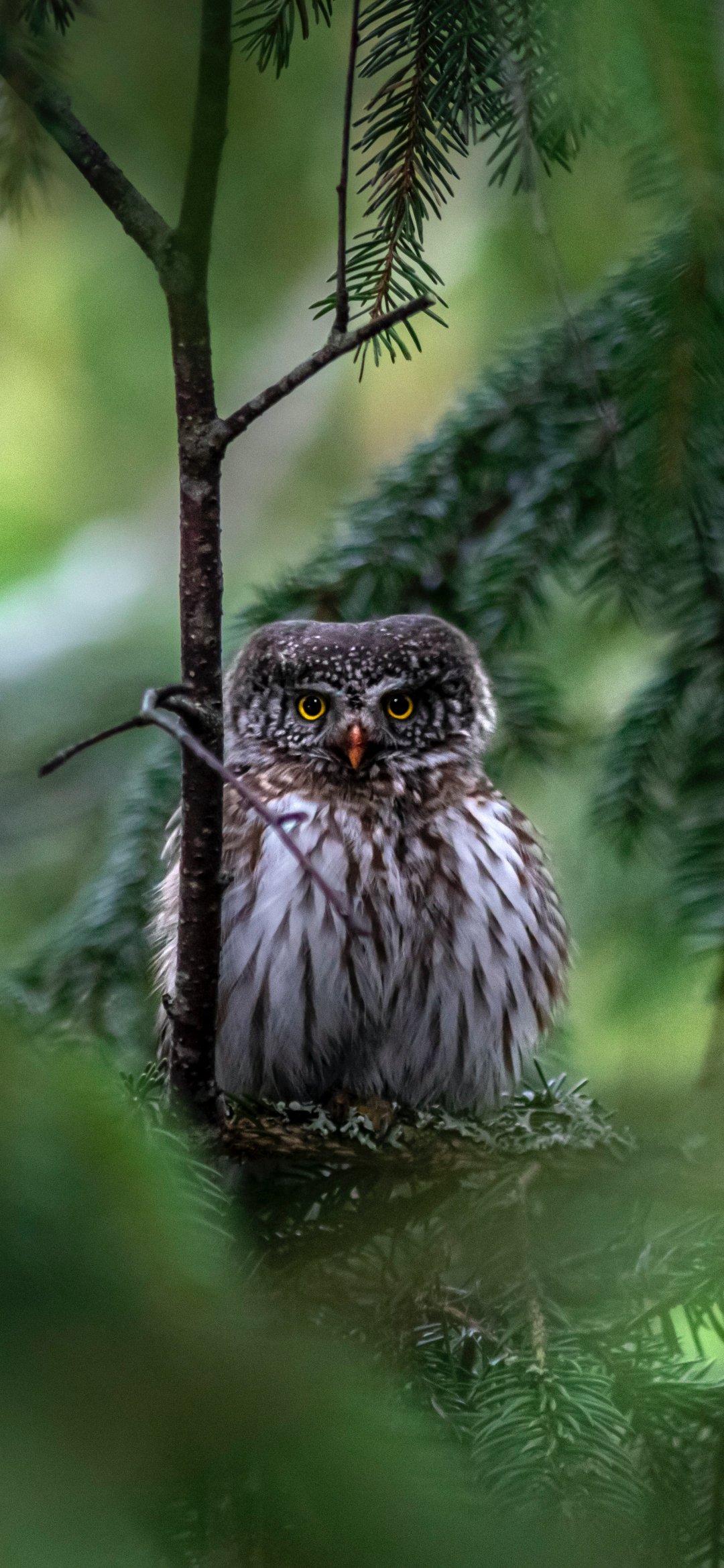 Обои: сова, в еловых ветках - 1080x2340