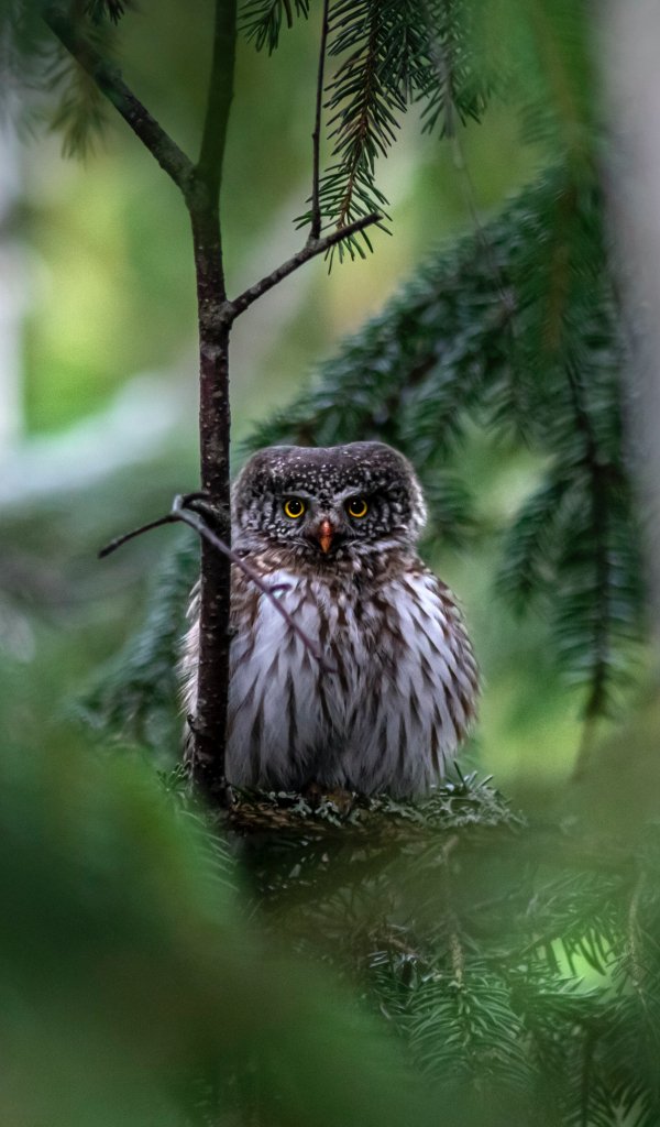 Обои: сова, в еловых ветках - 600x1024
