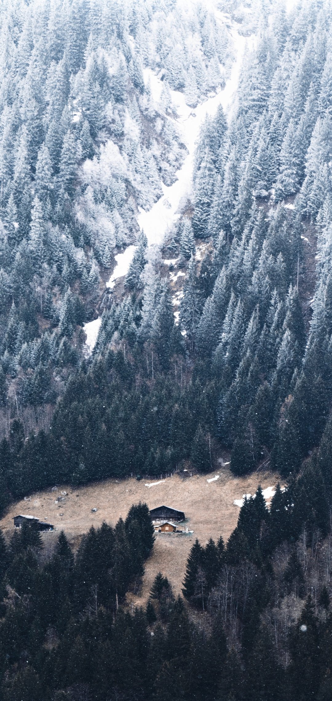 Обои: гора, спуск, домик в гарах - 1080x2280