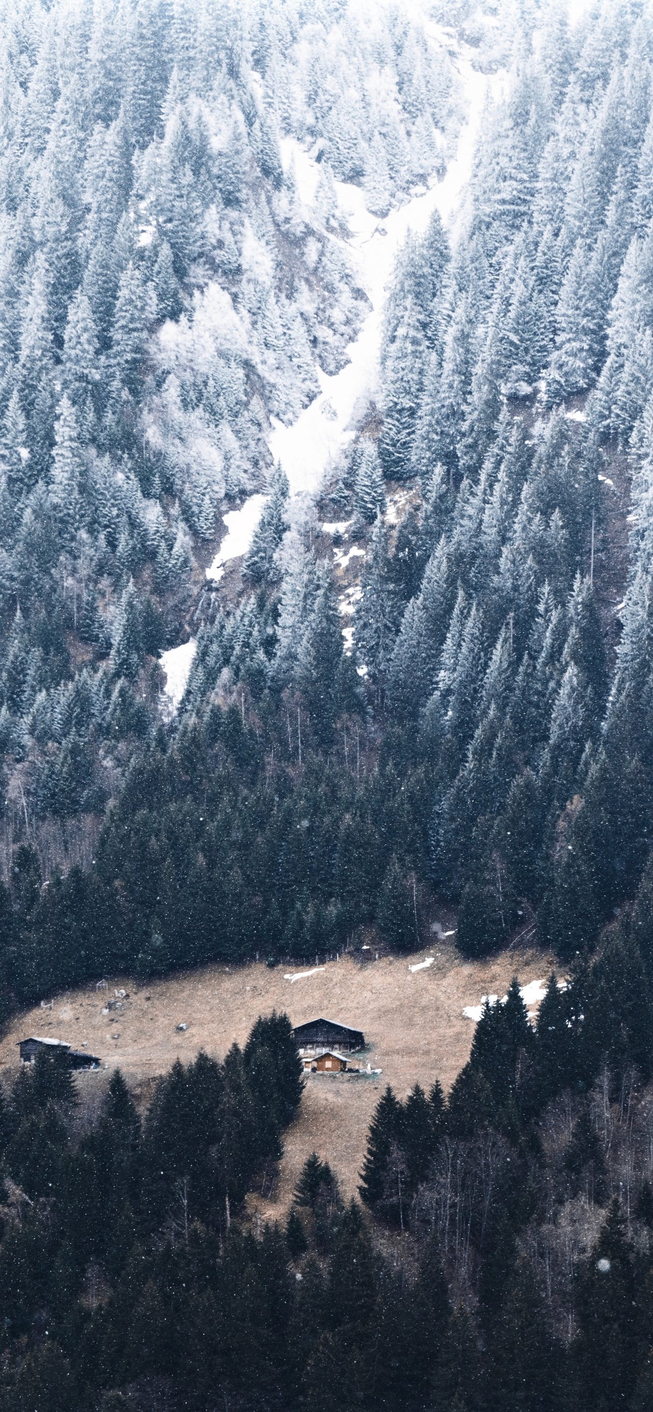 Обои: гора, спуск, домик в гарах - 1284x2778