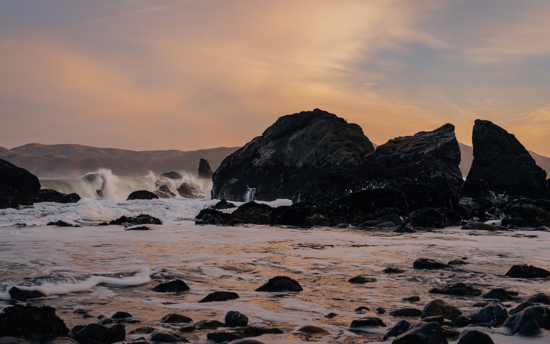 морские волны, морская пена, берег