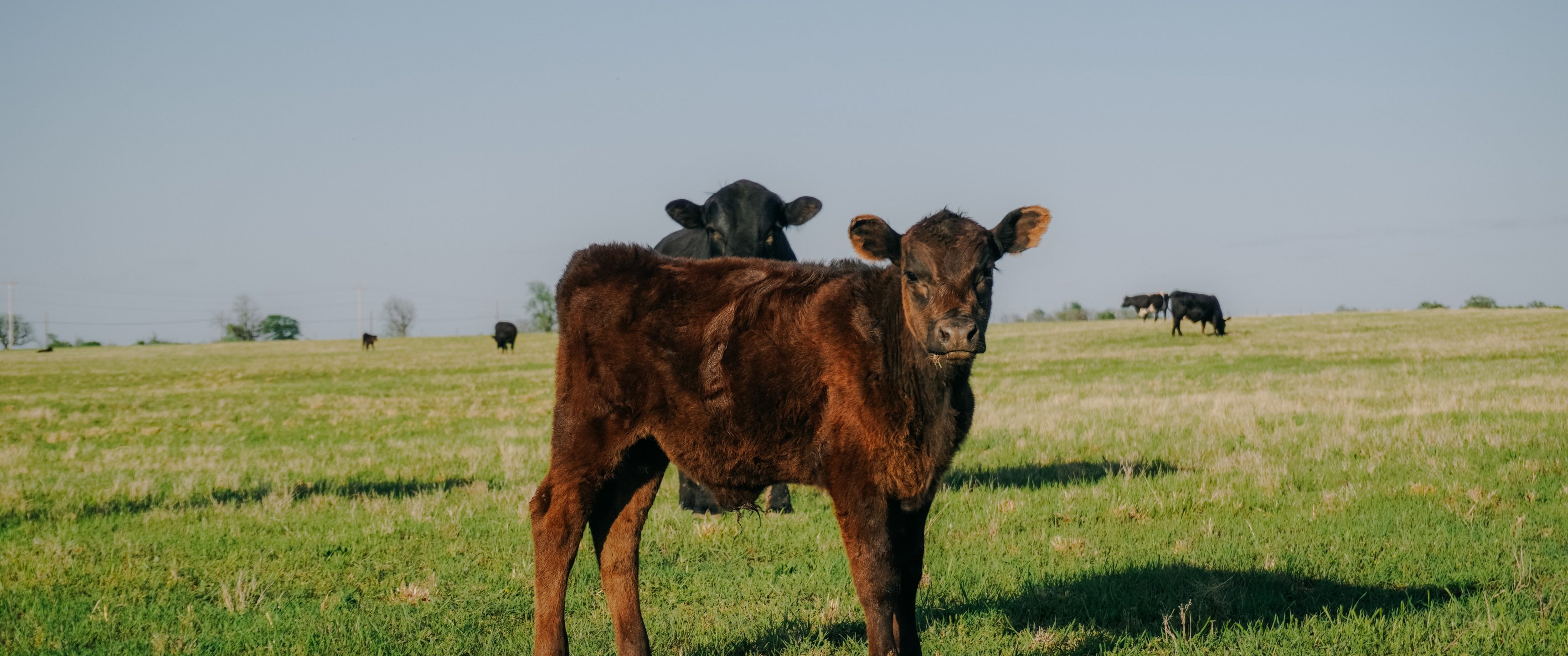 Обои: телята, на пастбище - 3440x1440