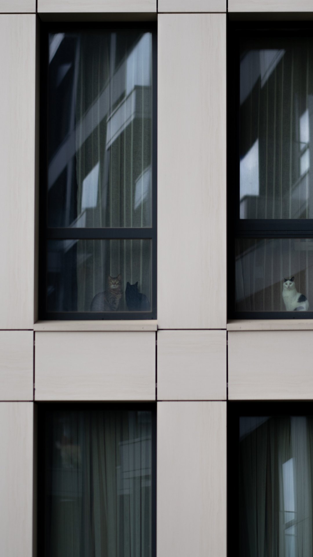 Обои: серый дом, кошки в окошках - 1080x1920
