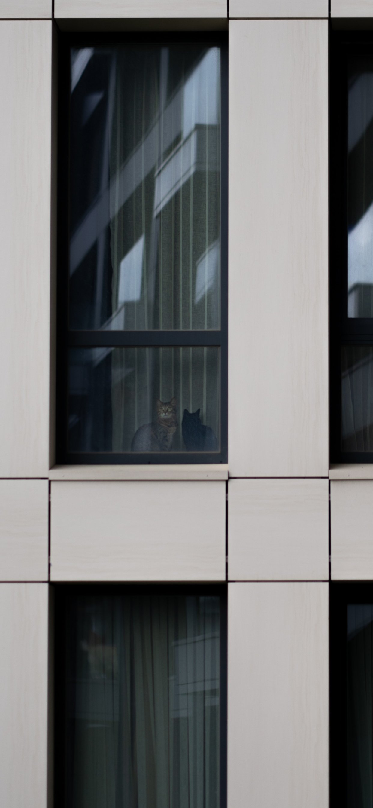 Обои: серый дом, кошки в окошках - 1242x2688