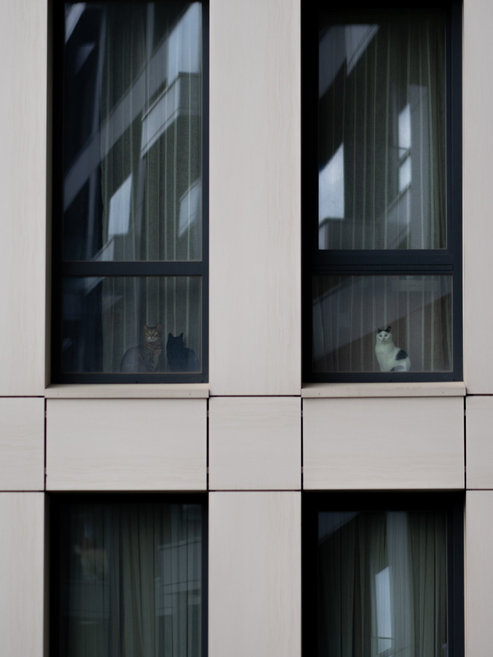 Обои: серый дом, кошки в окошках - 1668x2224