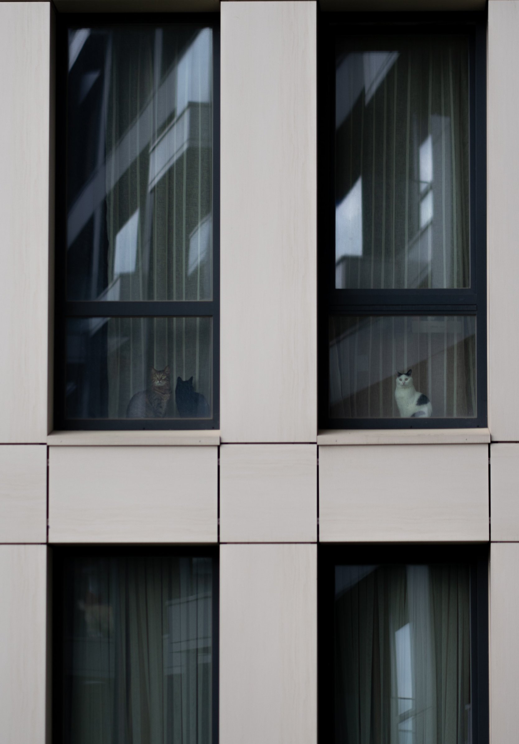 Обои: серый дом, кошки в окошках - 1668x2388