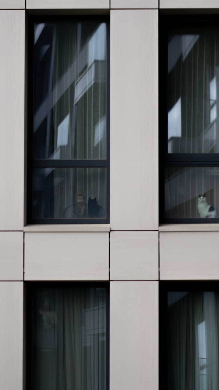 Обои: серый дом, кошки в окошках - 750x1334