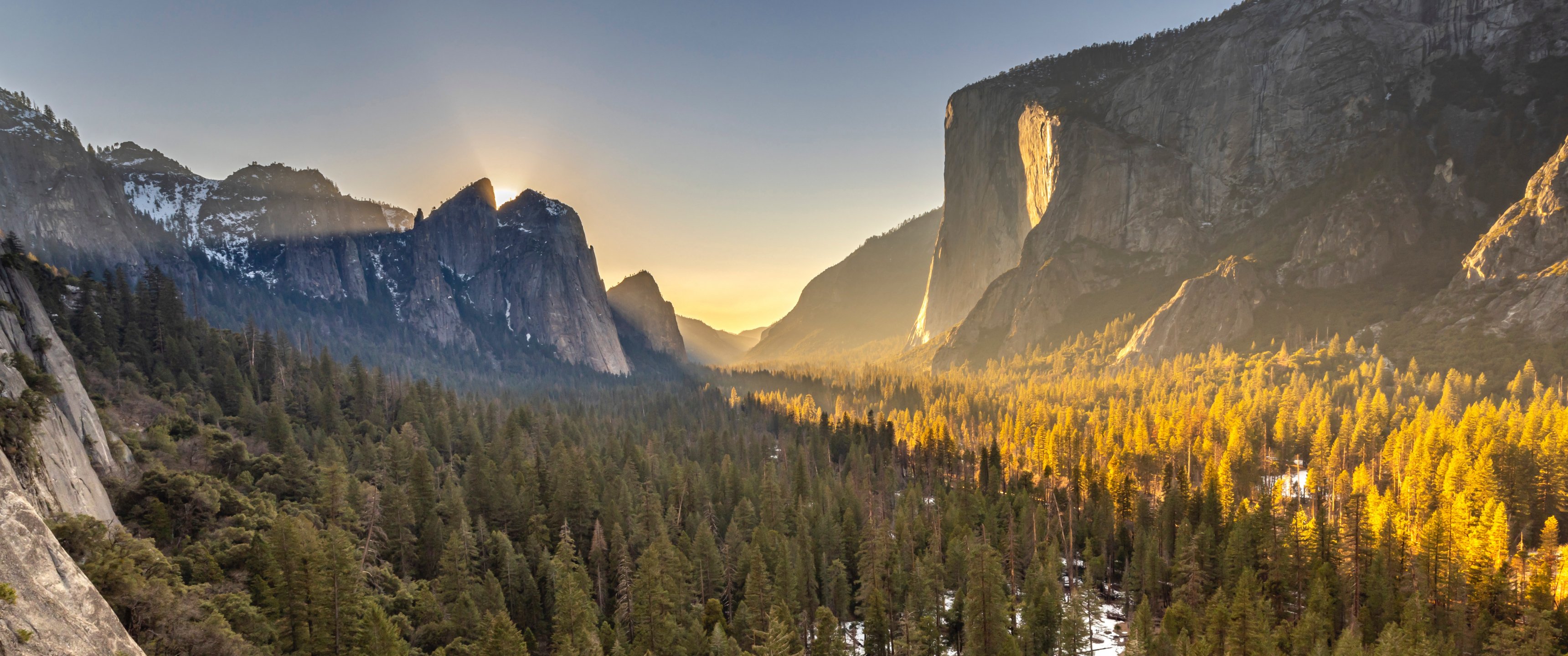 Обои: лес в горах, горные вершины - 3440x1440
