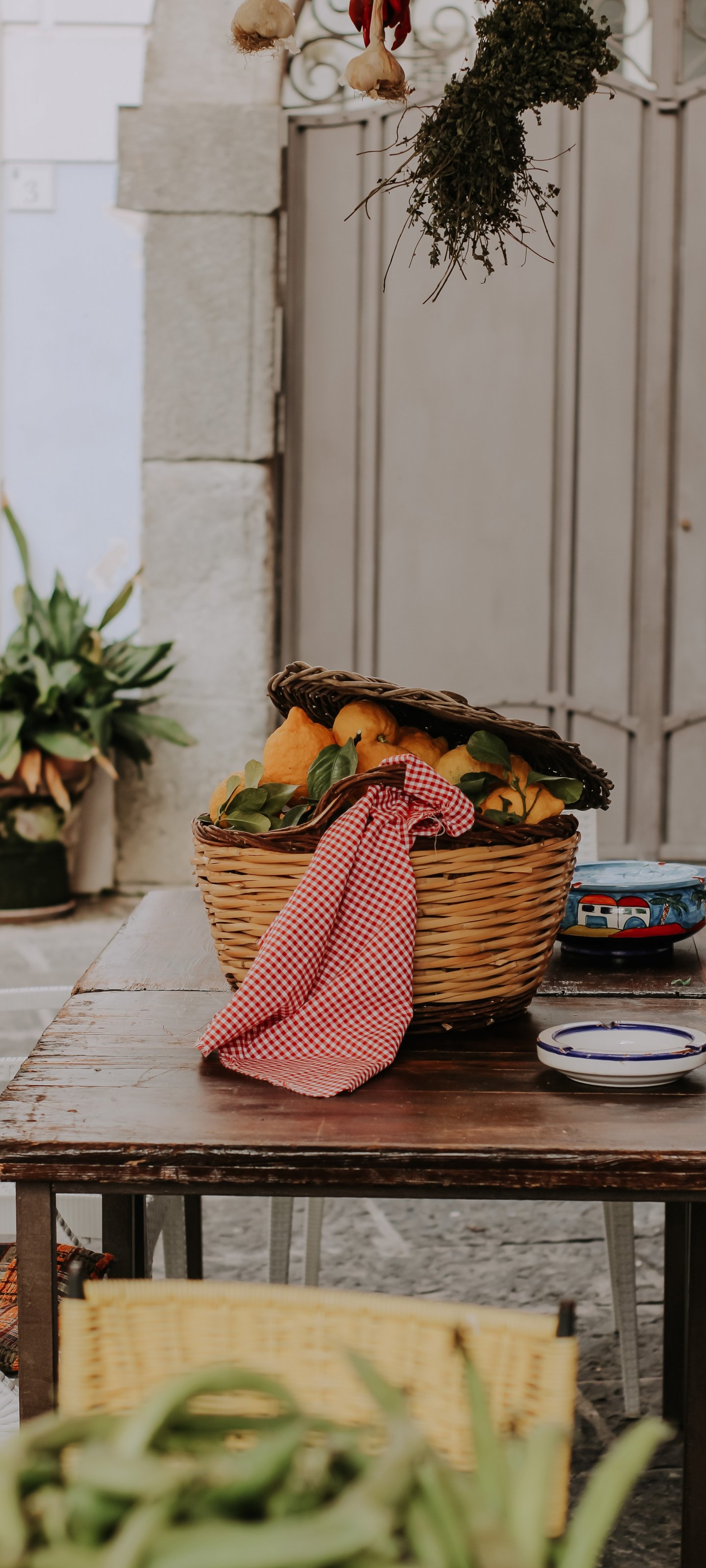Обои: во дворе, корзина с лимонами - 1440x3200