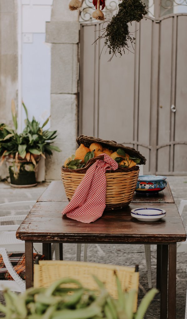 Обои: во дворе, корзина с лимонами - 600x1024