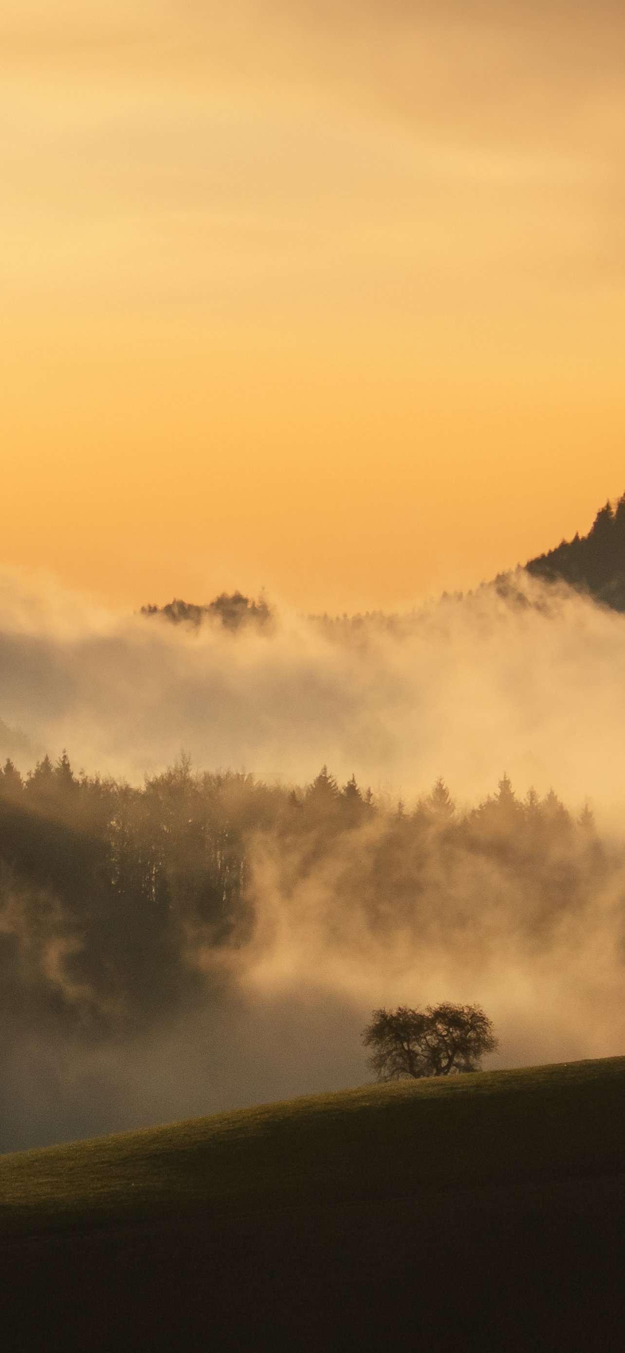Обои: рассвет, долина, туман - 1284x2778