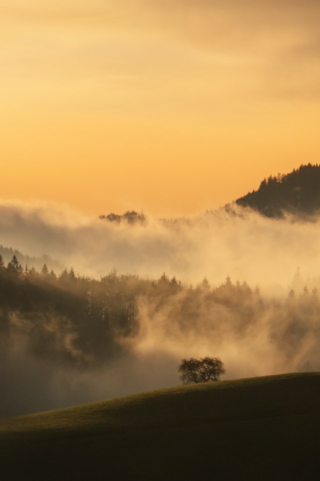 Обои: рассвет, долина, туман - 640x960