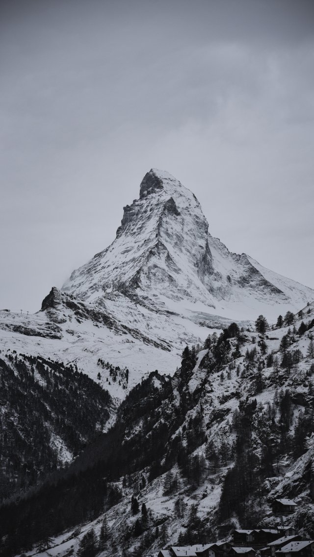Обои: снежная гора, лес - 640x1136
