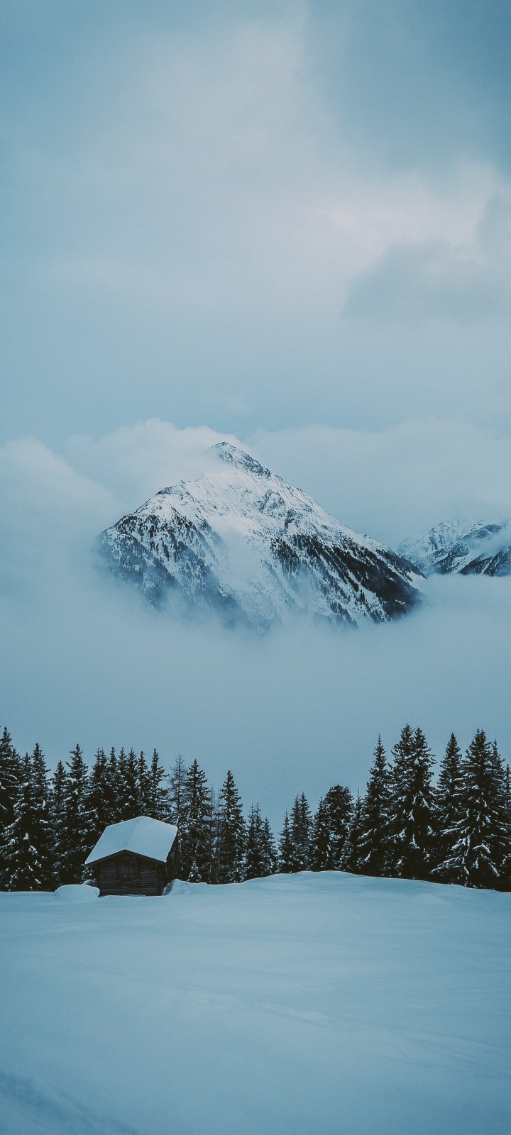 Обои: снежная гора, домик - 720x1600