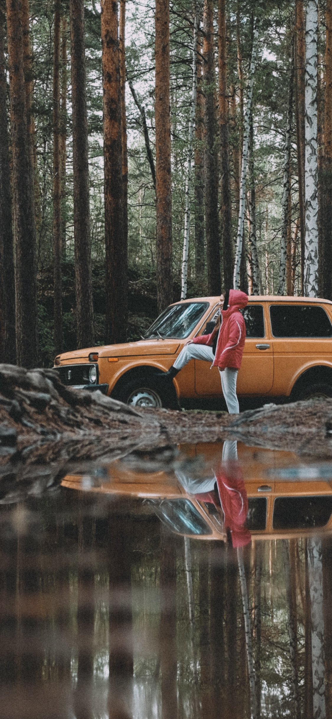 Обои: в лесу, на машине - 1125x2436