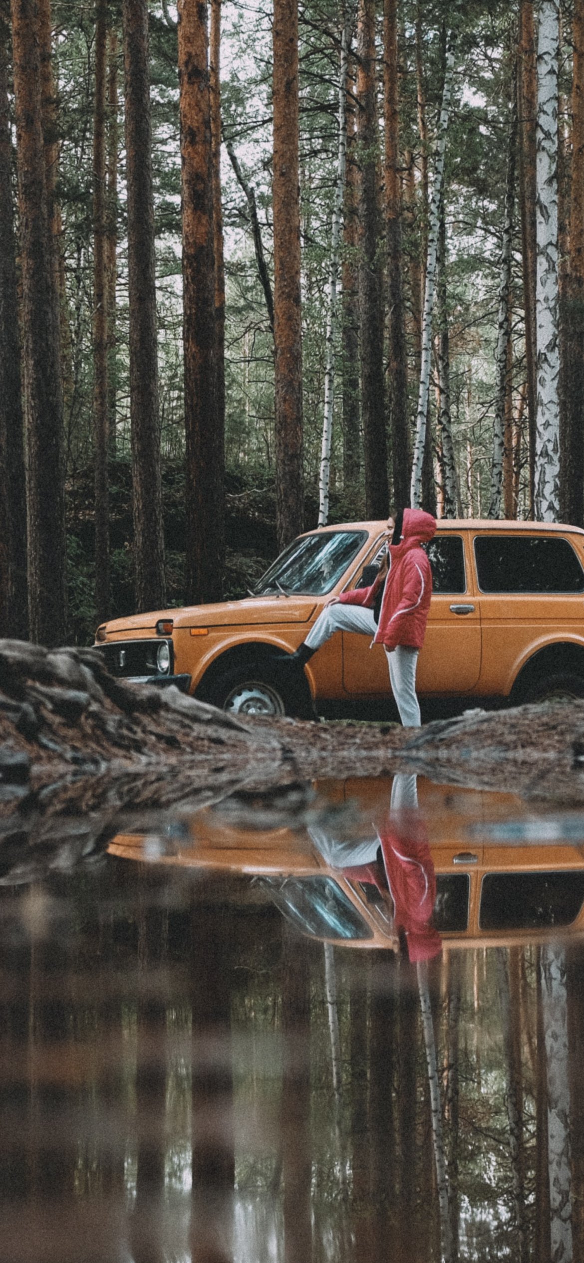 Обои: в лесу, на машине - 1170x2532