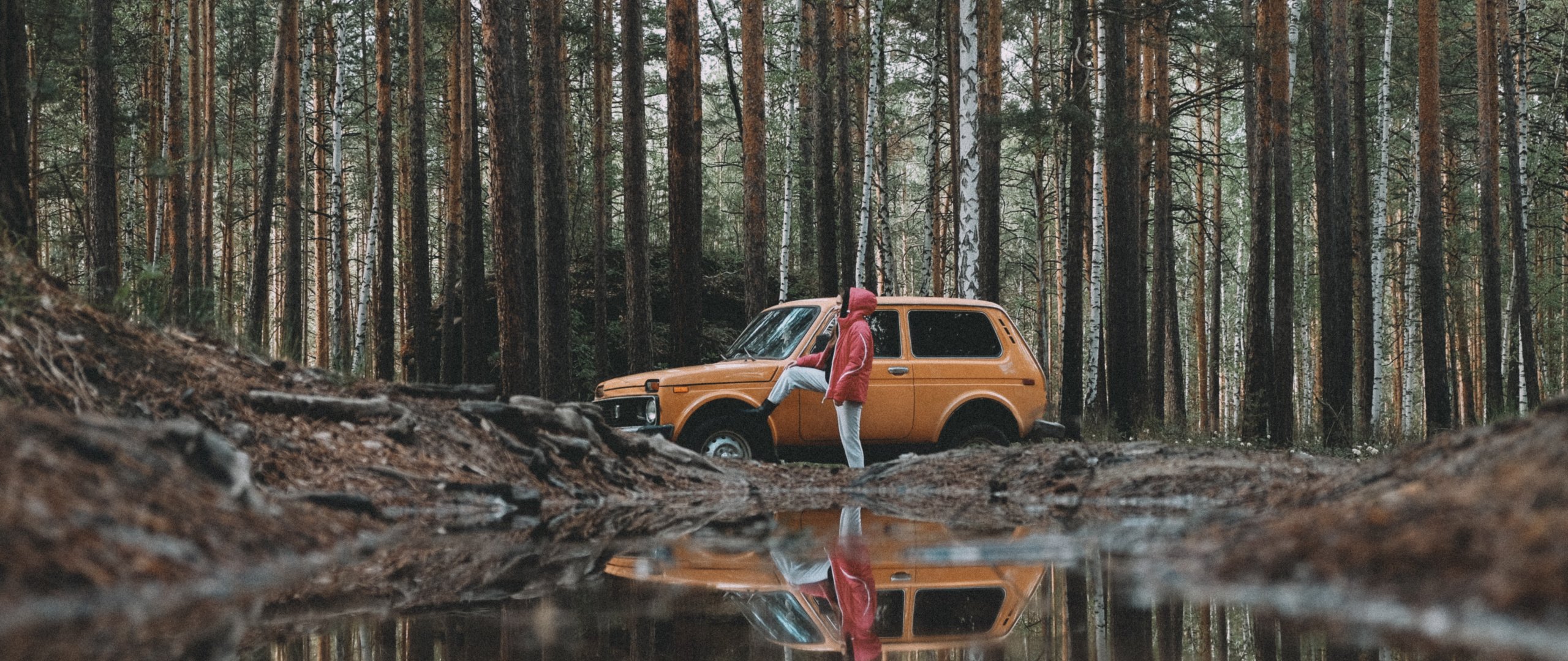 Обои: в лесу, на машине - 2560x1080