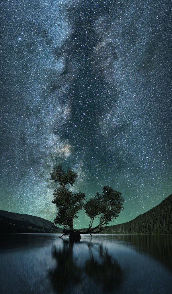 млечный путь, дерево, озеро