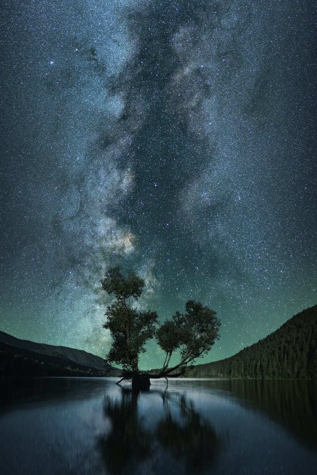млечный путь, дерево, озеро