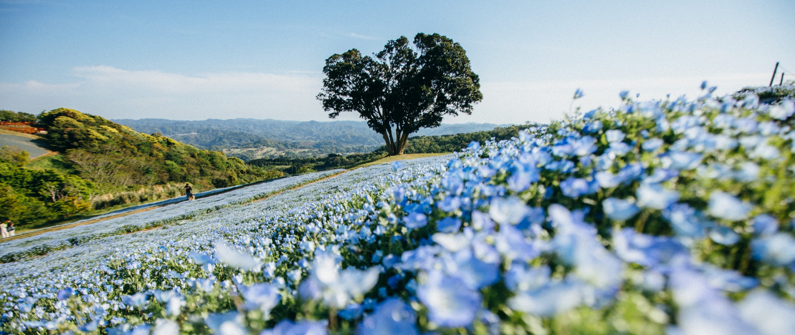 Обои: цветочное поле, дерево - 2560x1080