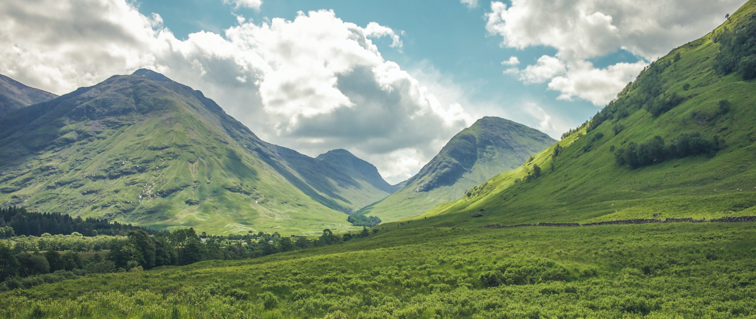 Обои: долина, холмы, Шотландия - 2560x1080