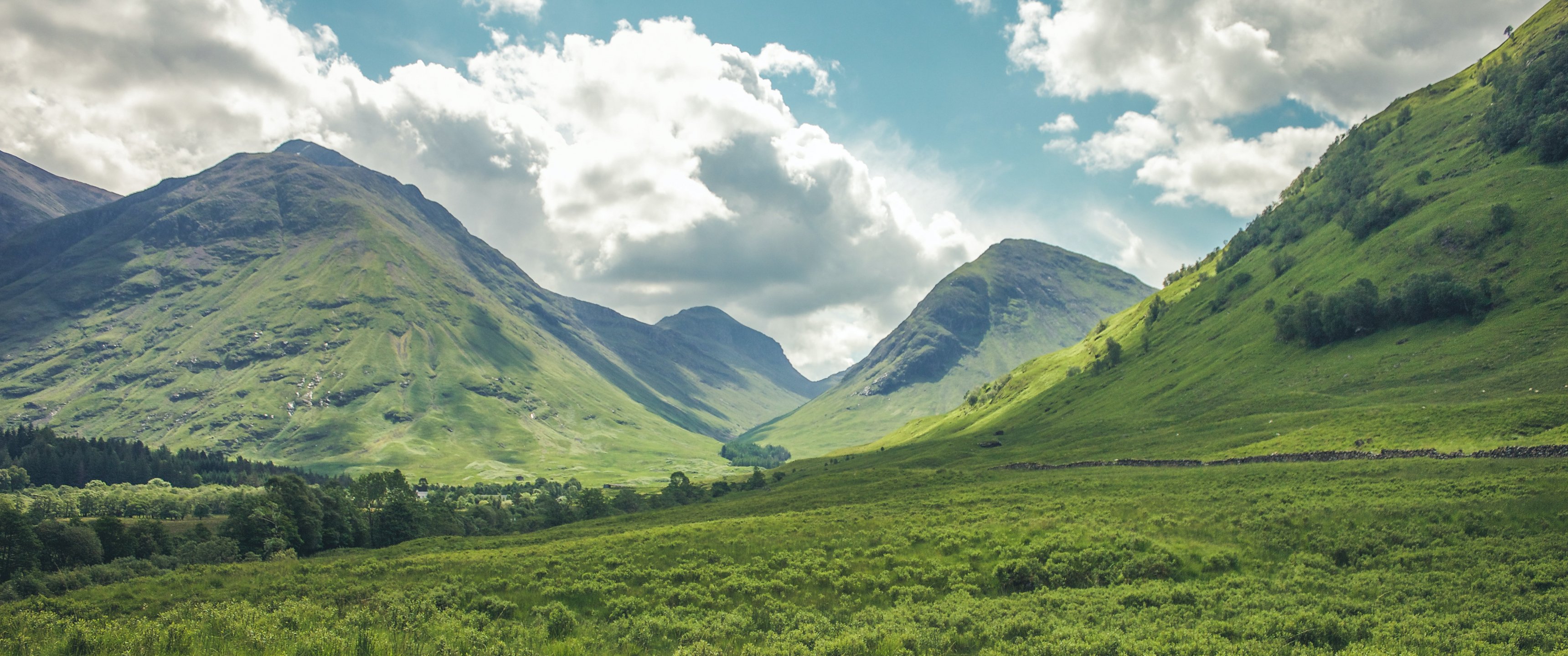 Обои: долина, холмы, Шотландия - 3440x1440