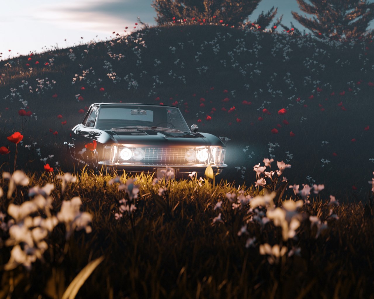 Обои: цветущее поле, машина - 1280x1024