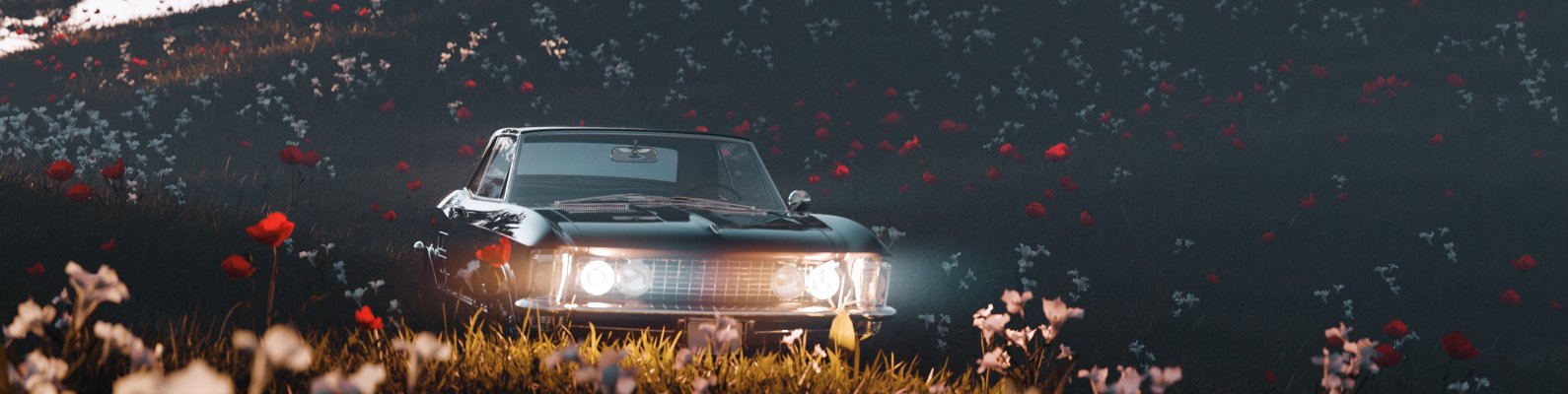 Обои: цветущее поле, машина - 1590x400