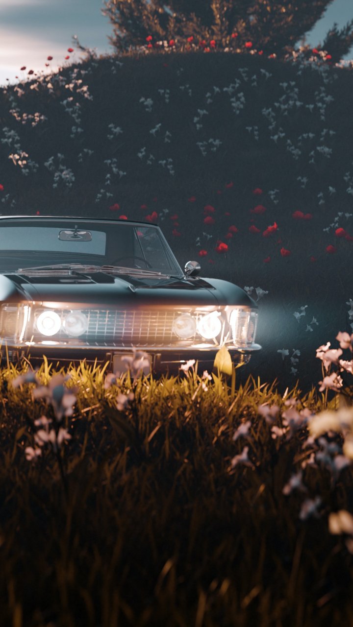 Обои: цветущее поле, машина - 720x1280