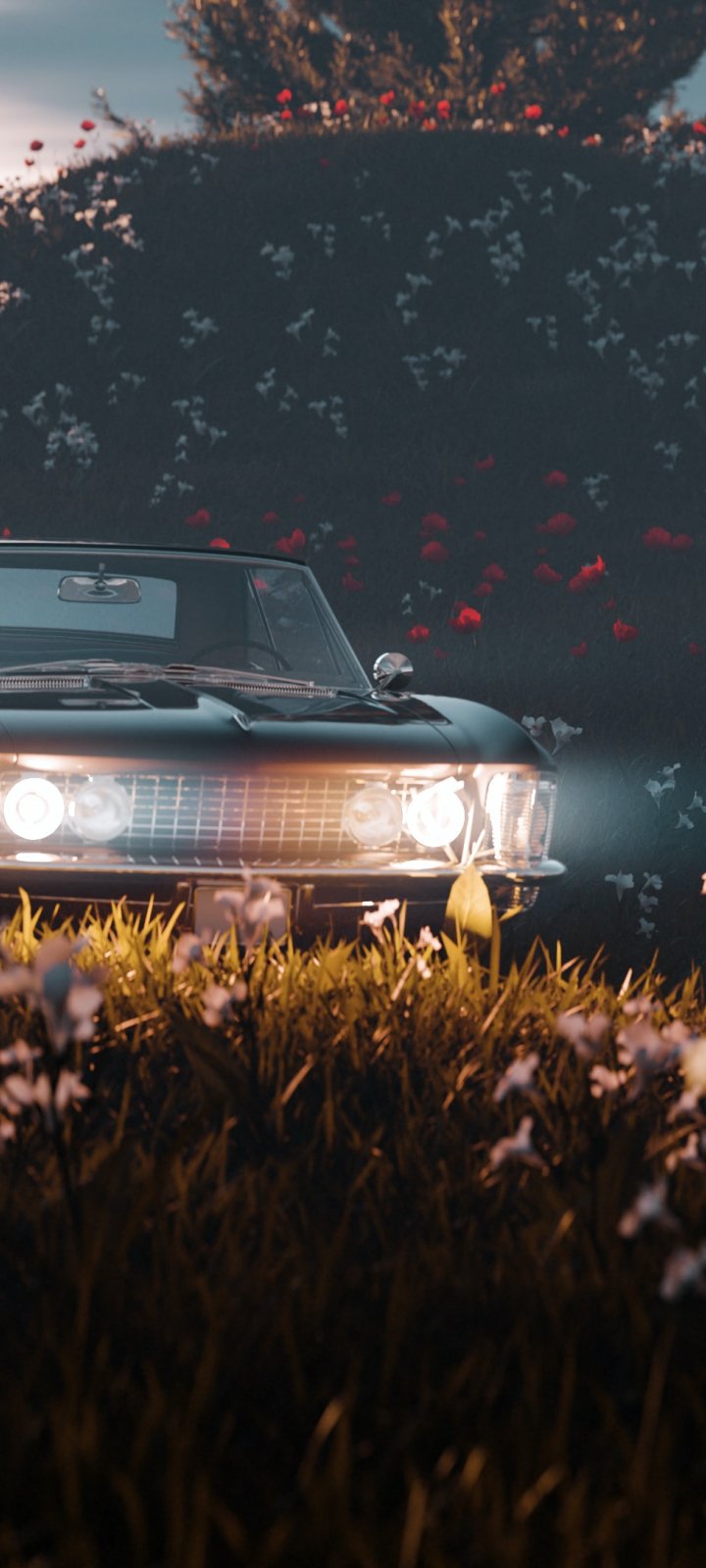 Обои: цветущее поле, машина - 720x1600
