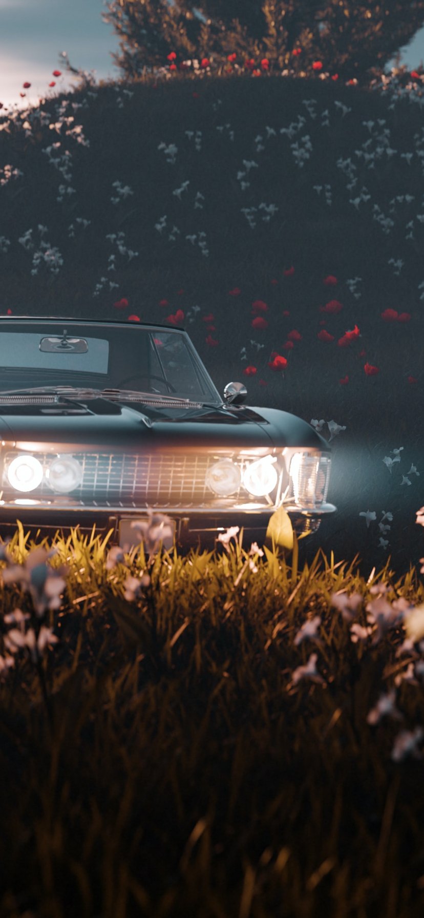 Обои: цветущее поле, машина - 828x1792