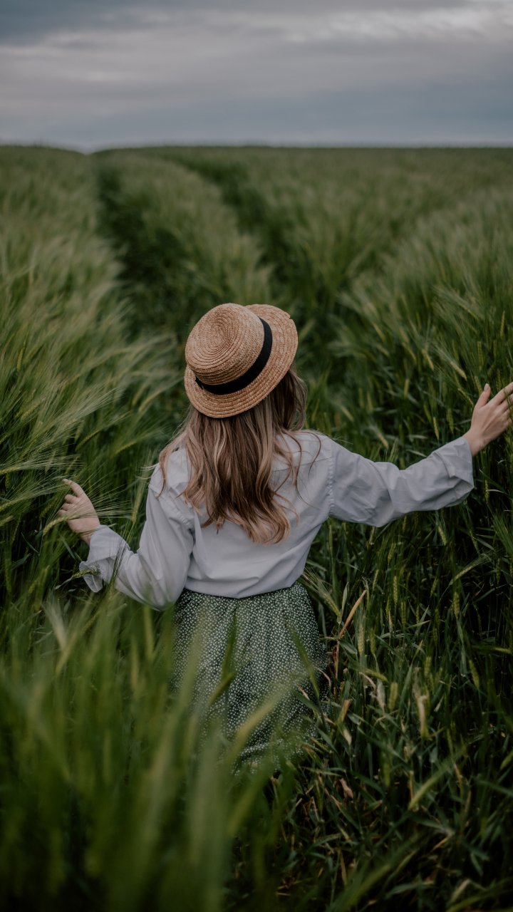 Обои: поле, девушка в шляпе - 720x1280