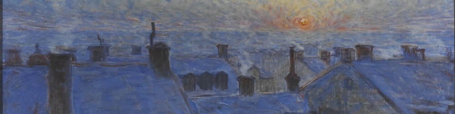 Обои: картина, восход солнца над крышами - 1590x400