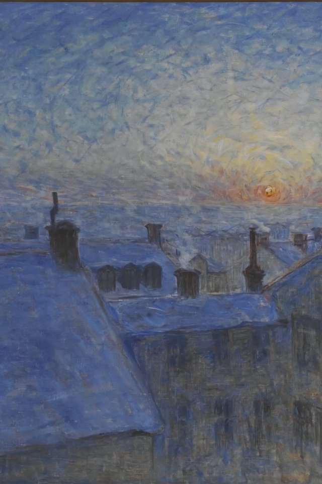 Обои: картина, восход солнца над крышами - 640x960